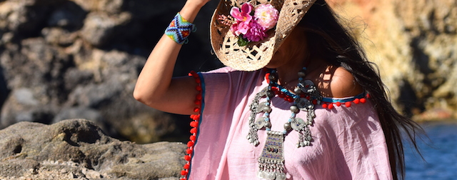 Hacia muy buen tiempo, pero con mucho viento, y llevo este caftán de color rosa con adornos florales de Bohemian Barcelona con el guapisimo sombrero siempre con flores.